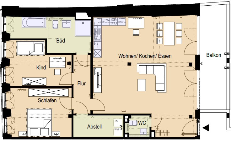 Aufzug, Balkon, Einbauküche, Gäste-WC, Kabel-TV, Klingel mit Sprechanlage, Vollbad, Waschmaschinenanschluss, Wohnküche,