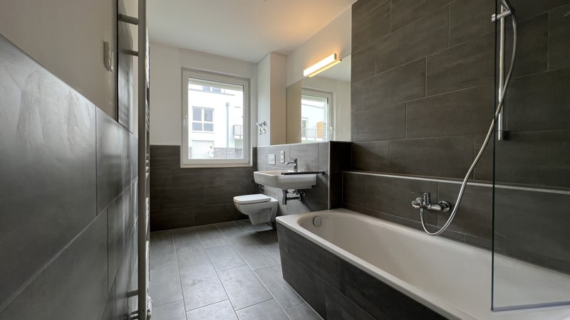 • stilvolle Bäder mit weißen Marken-Sanitärobjekten (wandhängendes Tiefspül-WC, Waschtisch, verchromte Armaturen, Badewanne und/oder bodengleiche Dusche), teilweise mit Gäste-WC