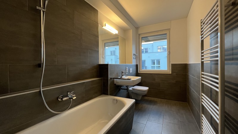 • stilvolle Bäder mit weißen Marken-Sanitärobjekten (wandhängendes Tiefspül-WC, Waschtisch, verchromte Armaturen, Badewanne und/oder bodengleiche Dusche), teilweise mit Gäste-WC
