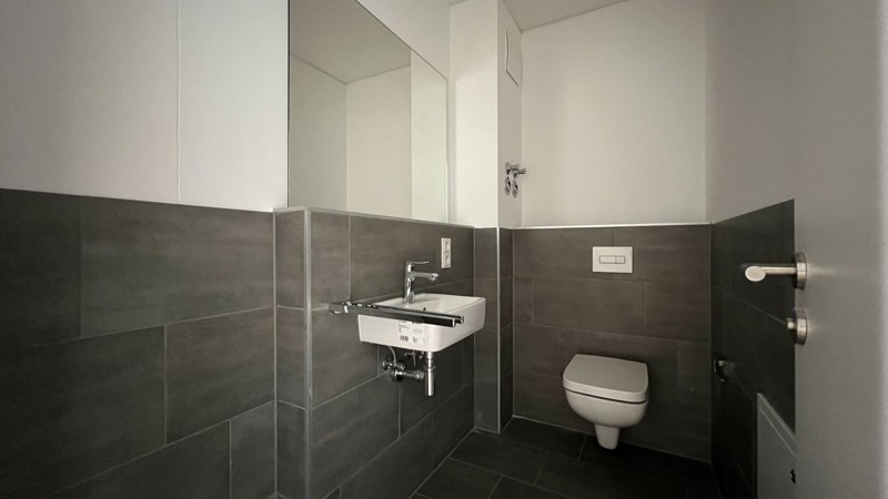 • stilvolle Bäder mit weißen Marken-Sanitärobjekten (wandhängendes Tiefspül-WC, Waschtisch, verchromte Armaturen, Badewanne und/oder bodengleiche Dusche), teilweise mit Gäste-WC