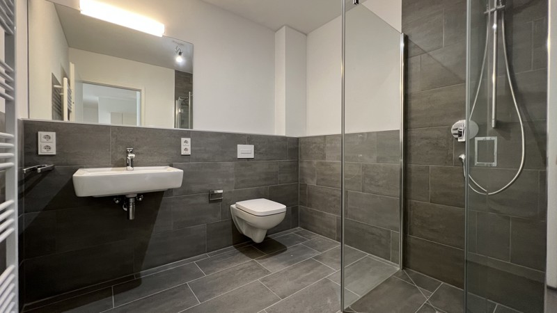 • stilvolle Bäder mit weißen Marken-Sanitärobjekten (wandhängendes Tiefspül-WC, Waschtisch, verchromte Armaturen, Badewanne und/oder bodengleiche Dusche), teilweise mit Gäste-WC