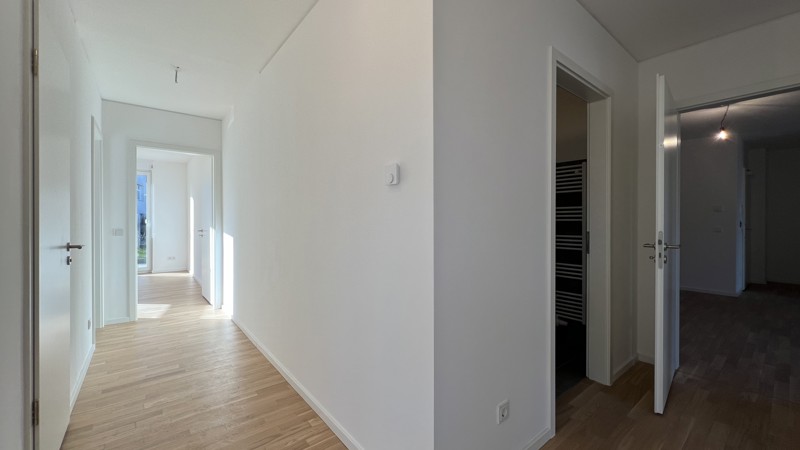 • hochwertige Parkettböden in Wohn-/Schlafbereichen, Flur, Diele, offenen Küchen, Essbereichen