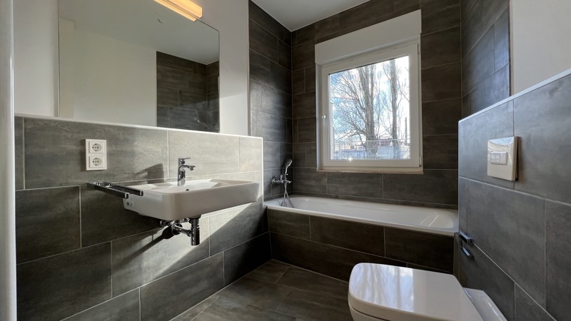 • stilvolle Bäder mit weißen Marken-Sanitärobjekten (wandhängendes Tiefspül-WC, Waschtisch, verchromte Armaturen, Badewanne und/oder bodengleiche Dusche), teilweise mit Gäste-WC