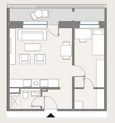 Das Wohnzimmer mit der offenen Küche, verfügt über einen direkten Zugang zum Balkon,