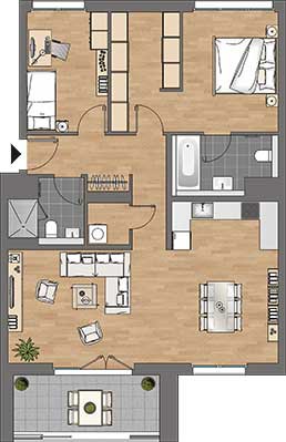 Erleben Sie Wohnkomfort der Extraklasse: In dieser großzügigen Etagenwohnung genießen Sie lichtdurchflutete Räume, veredelt mit Eiche-Massivparkett und angenehmer Fußbodenheizung. Die moderne, offene Einbauküche lädt zu individuellen Gestaltungsmöglichkeiten ein und wird durch einen praktischen Abstellraum ergänzt, der zusätzlichen Stauraum bietet. Das Schlafzimmer begeistert mit direktem Zugang zu Bad und separatem Ankleidebereich und sorgt so für höchsten Komfort. Zwei stilvolle Bäder – eines mit Badewanne, das andere mit Dusche – bieten Flexibilität im Alltag. Die integrierte Loggia schafft einen harmonischen Übergang zwischen Innen- und Außenbereich. Ein privater Tiefgaragenplatz rundet dieses exklusive Angebot ab.