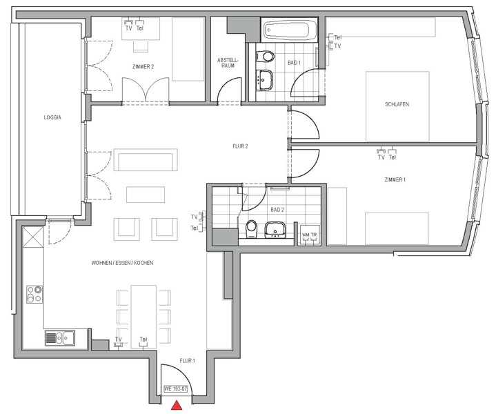 Aufzug, Duschbad, Einbauküche, Gäste-WC, Hausmeister, Kabel-TV, Keller, Klingel mit Sprechanlage, Loggia, Parkett, Stellplatz, Vollbad, Waschmaschinenanschluss, Wohnküche,