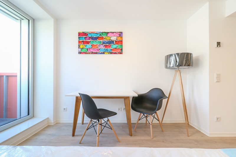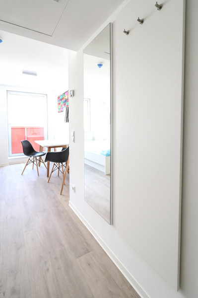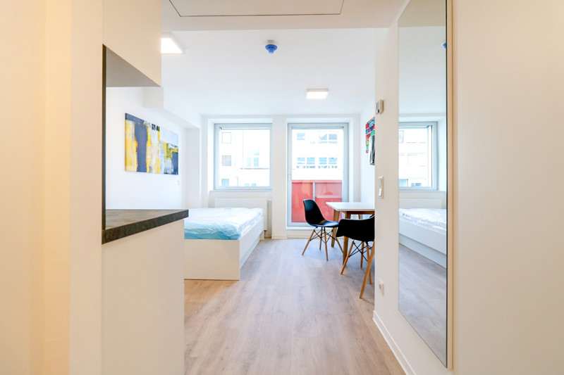 Direkt gegenüber dem Hauptbahnhof, im Herzen von Düsseldorf, erwarten Sie 54 moderne und hochwertig ausgestattete, möblierte Micro-Apartments auf sieben Etagen im „Kap Corner, einem nachhaltig revitalisierten, ehemaligen Bürogebäude aus den 50er Jahren. Aufgrund der zentralen Lage ist das „Kap Corner“ bei Pendlern und Firmen, welche eine hohen Ansprüchen gerecht werdende Unterkunft suchen, besonders gefragt. Die Ausstattung der Apartments lässt keine Wünsche offen: moderne Möblierung (u.a. Bett mit Matratze, Tisch, Kleiderschrank, Stehleuchte, TV-Regal etc.), klassische Einbauküche mit modernen Markengeräten, hochwertiger Vinyl-Boden in Holzoptik, stilvoll gefliestes Bad mit Dusche und weißen Marken-Sanitärobjekten, moderne Klimaanlage für Ihre gewünschte Raumtemperatur und Türsprechanlage mit Farbdisplay. Über einen großen Aufzug gelangen Sie bequem auf Ihre Etage. Mehrere Waschmaschinen stehen zur individuellen Benutzung im Waschraum zur Verfügung.