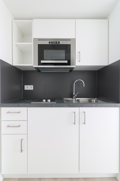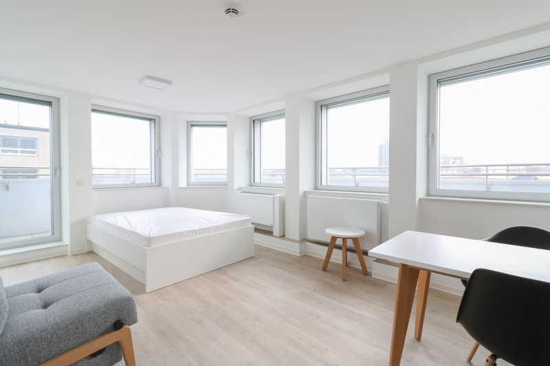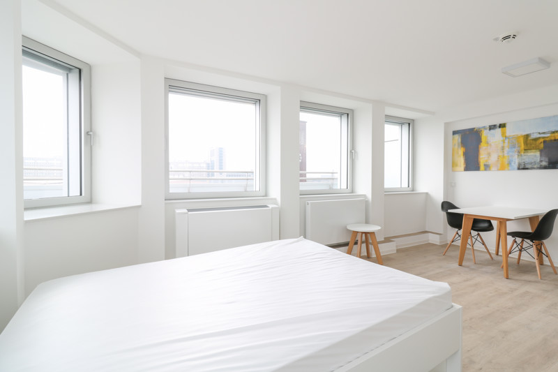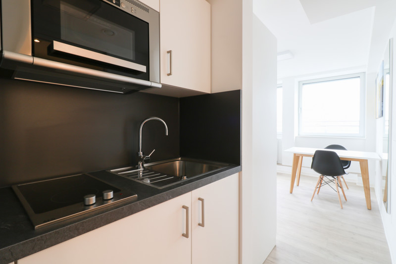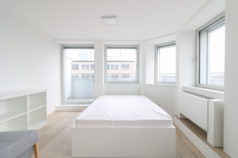 Direkt gegenüber dem Hauptbahnhof, im Herzen von Düsseldorf, erwarten Sie 54 moderne und hochwertig ausgestattete, möblierte Micro-Apartments auf sieben Etagen im „Kap Corner, einem nachhaltig revitalisierten, ehemaligen Bürogebäude aus den 50er Jahren. Aufgrund der zentralen Lage ist das „Kap Corner“ bei Pendlern und Firmen, welche eine hohen Ansprüchen gerecht werdende Unterkunft suchen, besonders gefragt. Die Ausstattung der Apartments lässt keine Wünsche offen: moderne Möblierung (u.a. Bett mit Matratze, Tisch, Kleiderschrank, Stehleuchte, TV-Regal etc.), klassische Einbauküche mit modernen Markengeräten, hochwertiger Vinyl-Boden in Holzoptik, stilvoll gefliestes Bad mit Dusche und weißen Marken-Sanitärobjekten, moderne Klimaanlage für Ihre gewünschte Raumtemperatur und Türsprechanlage mit Farbdisplay. Über einen großen Aufzug gelangen Sie bequem auf Ihre Etage. Mehrere Waschmaschinen stehen zur individuellen Benutzung im Waschraum zur Verfügung.