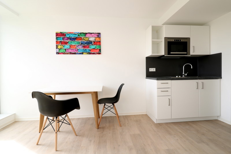 Direkt gegenüber dem Hauptbahnhof, im Herzen von Düsseldorf, erwarten Sie 54 moderne und hochwertig ausgestattete, möblierte Micro-Apartments auf sieben Etagen im „Kap Corner, einem nachhaltig revitalisierten, ehemaligen Bürogebäude aus den 50er Jahren. Aufgrund der zentralen Lage ist das „Kap Corner“ bei Pendlern und Firmen, welche eine hohen Ansprüchen gerecht werdende Unterkunft suchen, besonders gefragt. Die Ausstattung der Apartments lässt keine Wünsche offen: moderne Möblierung (u.a. Bett mit Matratze, Tisch, Kleiderschrank, Stehleuchte, TV-Regal etc.), klassische Einbauküche mit modernen Markengeräten, hochwertiger Vinyl-Boden in Holzoptik, stilvoll gefliestes Bad mit Dusche und weißen Marken-Sanitärobjekten, moderne Klimaanlage für Ihre gewünschte Raumtemperatur und Türsprechanlage mit Farbdisplay. Über einen großen Aufzug gelangen Sie bequem auf Ihre Etage. Mehrere Waschmaschinen stehen zur individuellen Benutzung im Waschraum zur Verfügung.