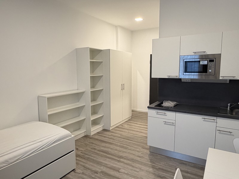 Die Apartments sind praktisch und funktional ausgestattet und eignen sich ideal für Studierende und Berufspendler. Jede Einheit verfügt über ein eigenes Bad, eine funktionale Küche, ein Bett, Schränke mit ausreichend Stauraum sowie einen Schreibtisch, der sich gut für Lernen oder mobiles Arbeiten eignet. Ein pflegeleichter Vinylboden verleiht den Apartments eine moderne Optik und ist zugleich robust und alltagstauglich.