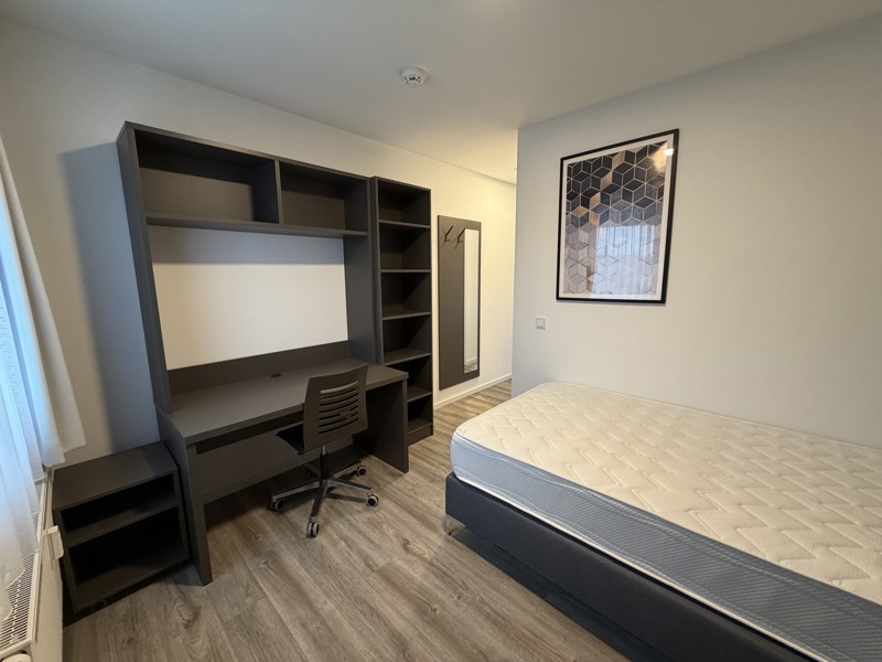 Die Apartments sind praktisch und funktional ausgestattet und eignen sich ideal für Studierende und Berufspendler. Jede Einheit verfügt über ein eigenes Bad, eine funktionale Küche, ein Bett, Schränke mit ausreichend Stauraum sowie einen Schreibtisch, der sich gut für Lernen oder mobiles Arbeiten eignet. Ein pflegeleichter Vinylboden verleiht den Apartments eine moderne Optik und ist zugleich robust und alltagstauglich.