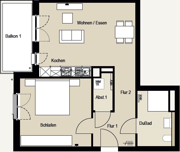 Balkon; Einbauküche; offene Küche; Abstellraum; Mieterkeller; Spielplatz; Dusche;