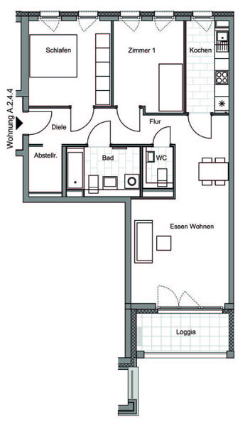 Aufzug, Einbauküche, Gäste-WC, Hausmeister, Klingel mit Sprechanlage, Loggia, Parkett, Stellplatz, Vollbad, Waschmaschinenanschluss,