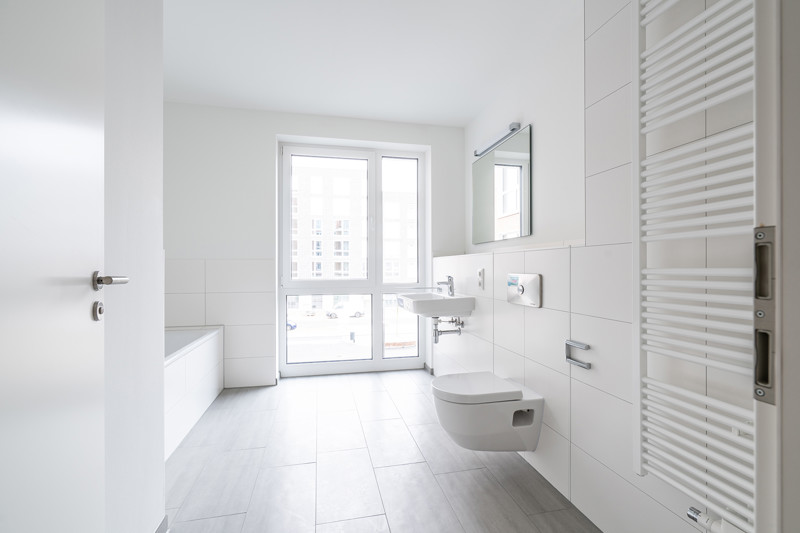 - stilvolle Bäder bzw. Duschbäder mit weißen Marken-Sanitärobjekten (wandhängendes Vakuum-Tiefspül-WC, Waschtisch, verchromte Armaturen, Badewanne, einige zusätzlich mit Dusche), teilw. mit Gäste-WC