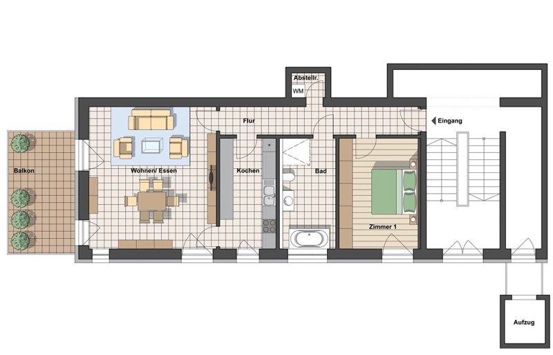 Diese charmante 2-Zimmer-Wohnung mit Balkon überzeugt durch ihre hellen, freundlich gestalteten Wohn- und Schlafräume, die mit hochwertigem Laminat und angenehmer Fußbodenheizung ein besonders wohnliches Ambiente schaffen. Der Wohnbereich bietet direkten Zugang zum Balkon und eignet sich ideal für geselliges Beisammensein. Ein praktischer Abstellraum sorgt für zusätzlichen Stauraum.