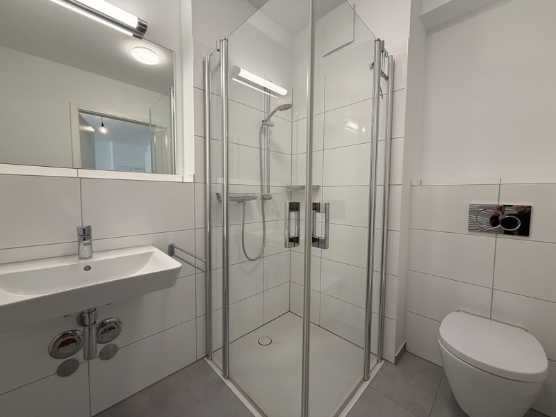 Auch die Badezimmer überzeugen durch eine moderne Gestaltung mit hochwertigen Fliesen, stilvollen Markenarmaturen sowie komfortablen Duschen. Malervlies an den Wänden sorgt für eine hochwertige und langlebige Oberflächengestaltung. Praktische Waschmaschinenstellplätze innerhalb der Wohnungen bieten zusätzlichen Komfort im Alltag.