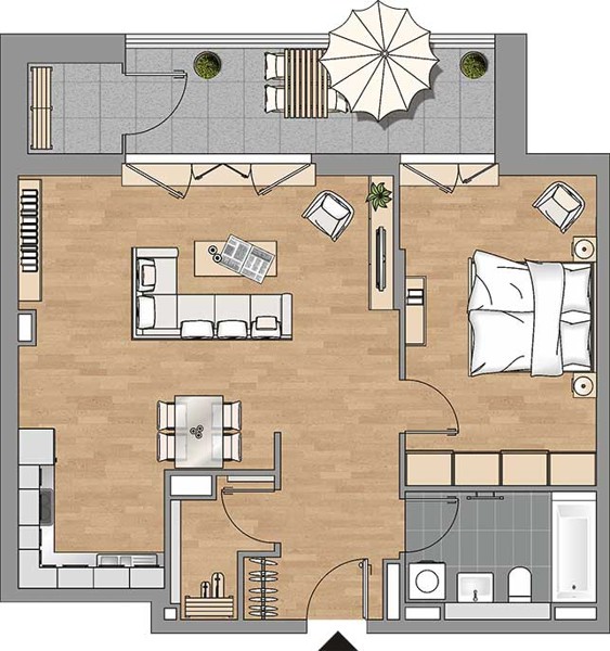 Lassen Sie den Alltag hinter sich: Relaxen auf dem Balkon, der Loggia , der (Dach)Terrasse oder ein gemütliches Treffen mit netten Nachbarn in den begrünten Innenhof-Oasen und Erholungsbereichen – ausschließlich für die Bewohner des UP!M. Auch die Tiefgarage mit der eigenen Ein- /Ausfahrt und Aufzugsanbindung in alle Wohnetagen schafft Komfort und Luxus.