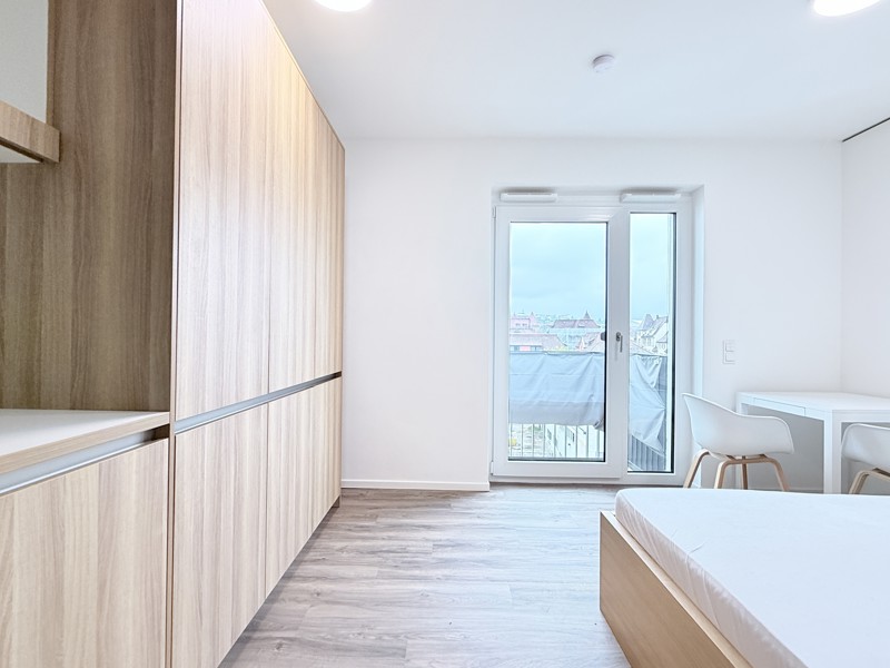 Der helle Wohn- und Schlafbereich bietet vielfältige Gestaltungsmöglichkeiten und schafft ein angenehmes Wohnambiente zum Wohnen, Arbeiten und Entspannen. Durch praktische Einbauschränke steht zudem ausreichend Stauraum zur Verfügung, sodass der Wohnraum optimal genutzt werden kann.