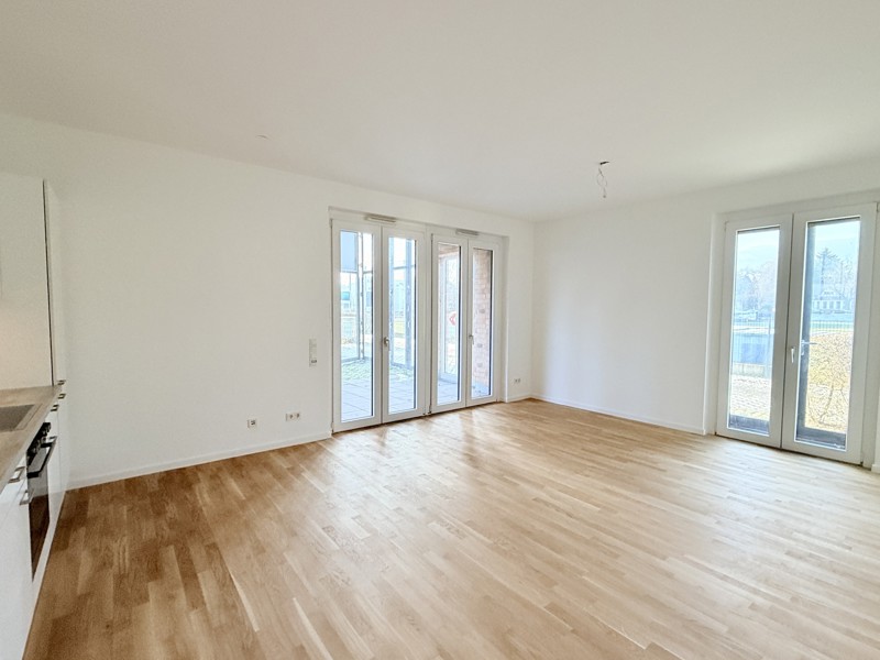 Ihre großzügige Erdgeschosswohnung ist in allen Wohn- und Schlafräumen mit Parkett und Fußbodenheizung ausgestattet. Wer helle Wohnungen mag, wird diese lichtdurchfluteten Räume lieben! Die offene Markenküche mit Einbaugeräten ist komplett ausgestattet und schafft ein ausgesprochen angenehmes Wohnambiente. Der zusätzliche Abstellraum schafft Platz. Das Highlight des großzügigen Schlafzimmers ist zweifellos der direkte Zugang zur Terrasse.  Das elegante Bad ist mit Dusche und WC ausgestattet. Besonders bequem ist auch der Waschmaschinenanschluss in Ihrer Wohnung. Der beiden Terrassen stellen höchste Wohn- und Lebensqualität sicher. Und als weiteres Highlight verfügt Ihre Wohnung über einen Gartenanteil. Zu Ihrer Wohnung gehört selbstverständlich auch ein großzügig bemessener Tiefgaragenplatz. Es erwarten Sie 166 Wohnungen, verteilt auf 12 Mehrfamilienhäuser. Jede Wohnung verfügt, je nach Etage, entweder über eine eigene Terrasse mit Gartenbereich, einen Balkon, Wintergarten oder eine Dachterrasse. Die Ausstattung lässt keine Wünsche offen: Eichenparkettboden mit Fußbodenheizung, dreifachverglaste Schallschutzfenster, hochwertige und vollständig ausgestattete Einbauküchen, Malerflies als Wandverkleidung, modern geflieste Bäder mit Markenarmaturen, Gegensprechanlage mit Videofunktion, Breitbandkabelanschluss in allen Räumen und viele Annehmlichkeiten mehr. Im Erdgeschoss des Komplexes befindet sich ein großer EDEKA-Markt, welcher über ein reichhaltiges Angebot verfügt. Auf dem Dach des Objektes befindet sich ein parkähnlich angelegter Innenhof, welcher exklusiv von den Mietern genutzt werden kann.